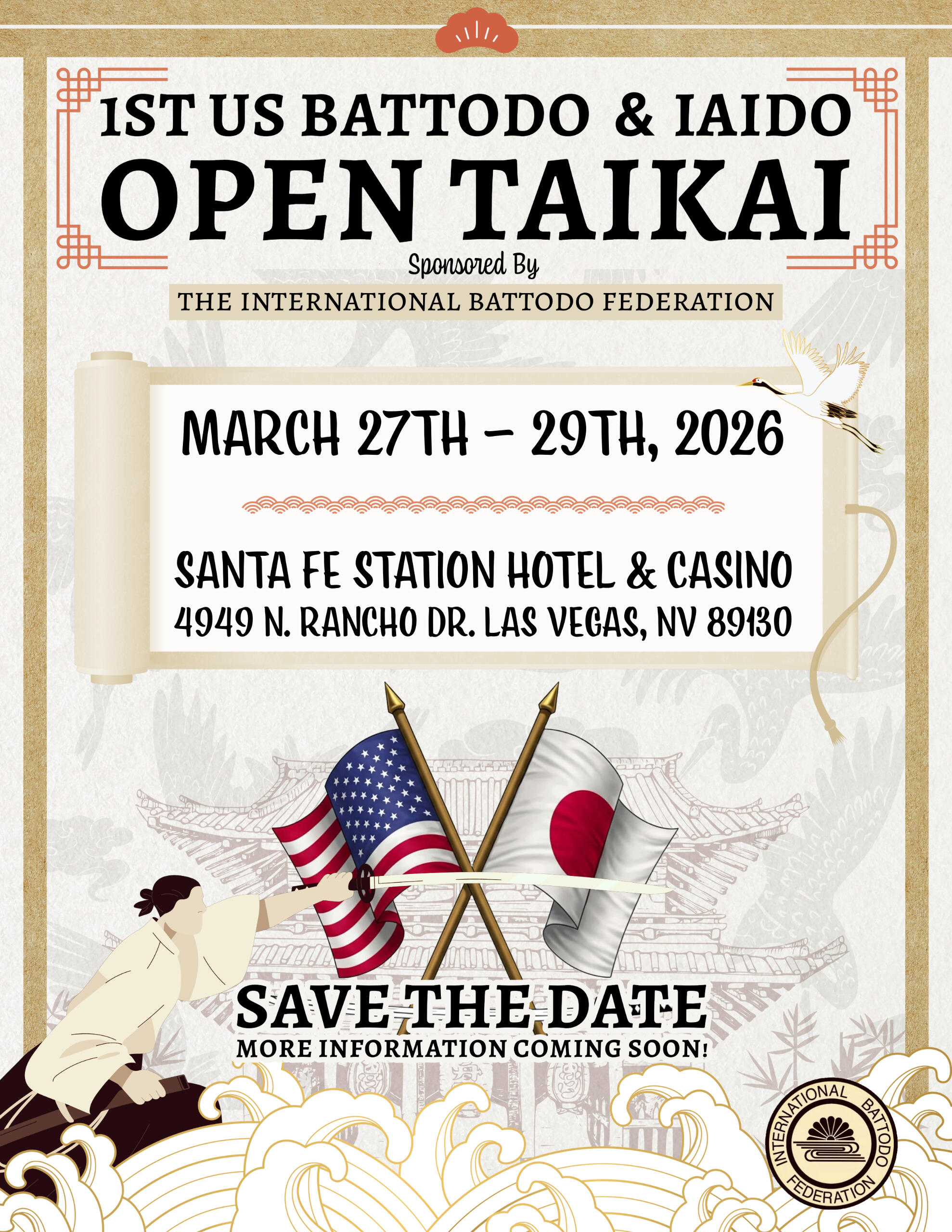 Friday March 27, 2026: Seminars begin at 9:00amSaturday March 28, 2026: Seminars begin at 9:00am (Shizan seminar and testing will take place on this day)Sunday March 29, 2026: Taikai will begin promptly at 9:00am, please arrive at 8:00am for check in and sword inspection